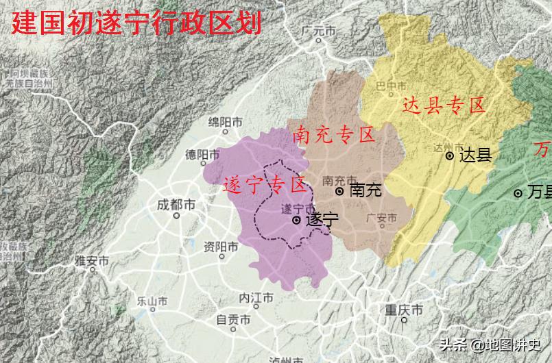 遂宁市原为四川省绵阳专区所辖遂宁县,1985年撤县建市,遂宁县与蓬溪县、射洪县组建成遂宁市,遂宁县辖区划为市中区。